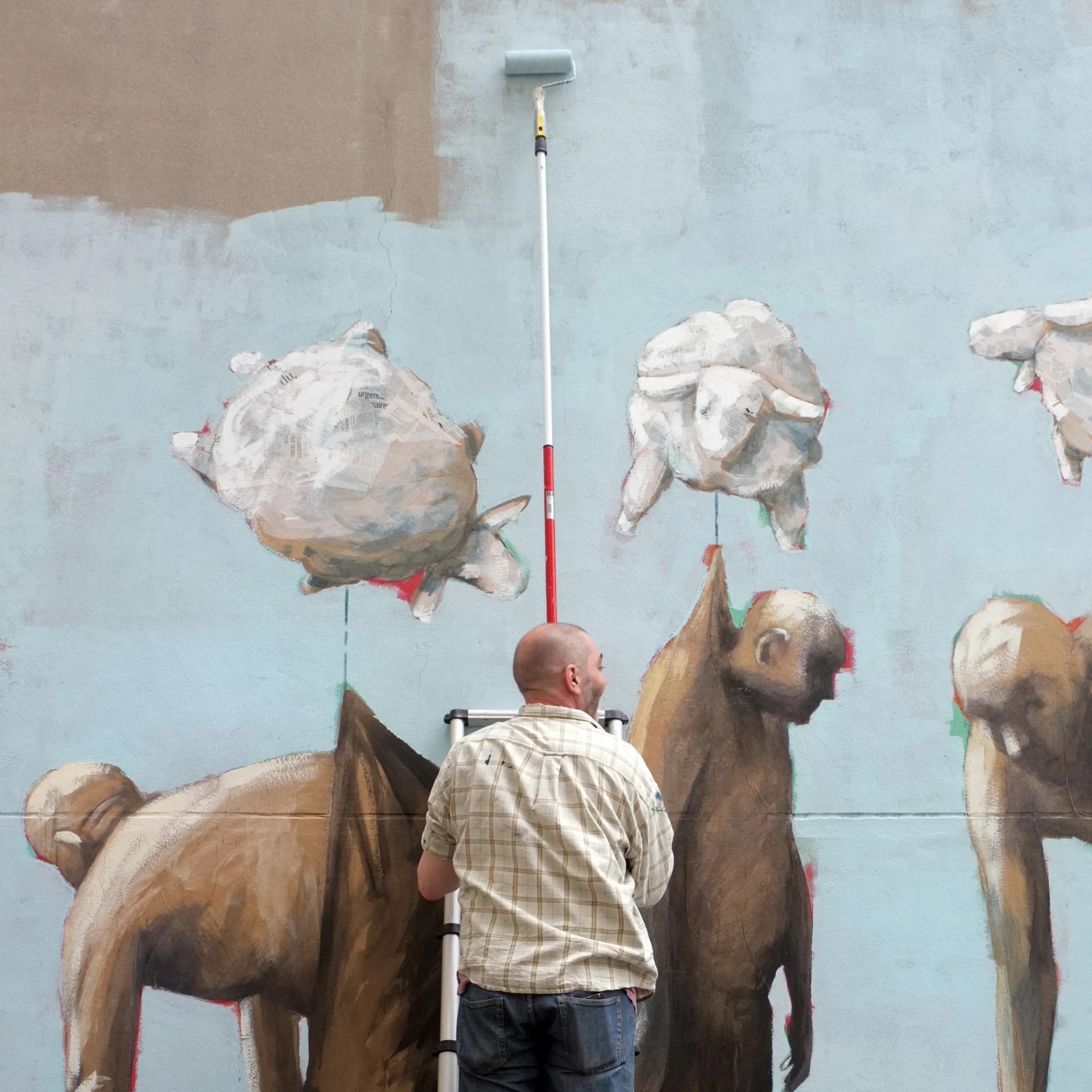 Ses hommes peints, esquissés, sans visage détaillé mais toujours avec des attributs (une bouée, une pagaie, un bonnet de bain, une maison...) et une allure similaire, se retrouvent sur les murs des rues du Nord-Est de Paris dès les années 2000, alors que sa carrière de peintre est déjà établie.
