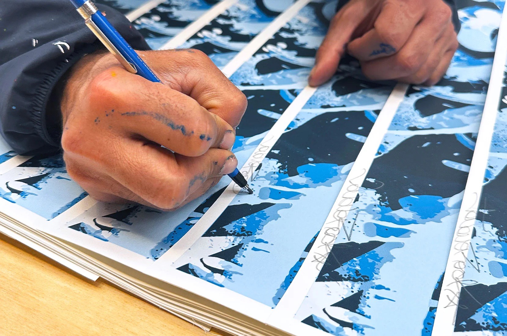 Bleu Horizons JonOne Année de réalisation 2025 Dimensions 70x50 cm Technique Sérigraphie en dix couleurs sur papier Technique Papier édition limitée Édition limitée de 100 exemplaires Signée et numérotée par l’artiste Papier Kingdom White 300 g/m² 950 euros Ajouter au panier