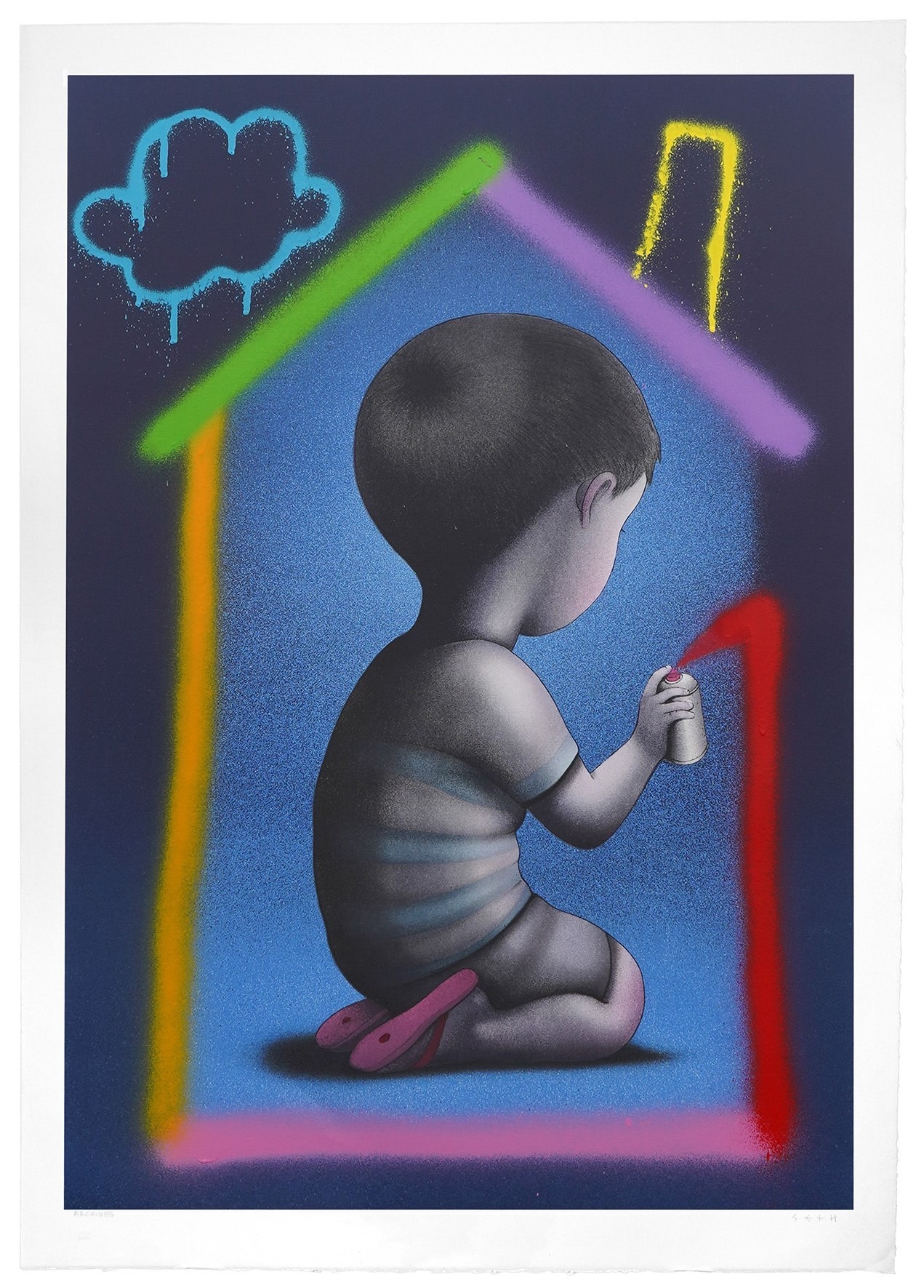 Trois ans après sa dernière lithographie « À la fenêtre », Seth nous propose « Dans ma maison », un tirage réhaussée à la bombe aérosol qui résonne avec sa fresque géante peinte en 2022 sur le mur d’un quartier populaire de Laon.